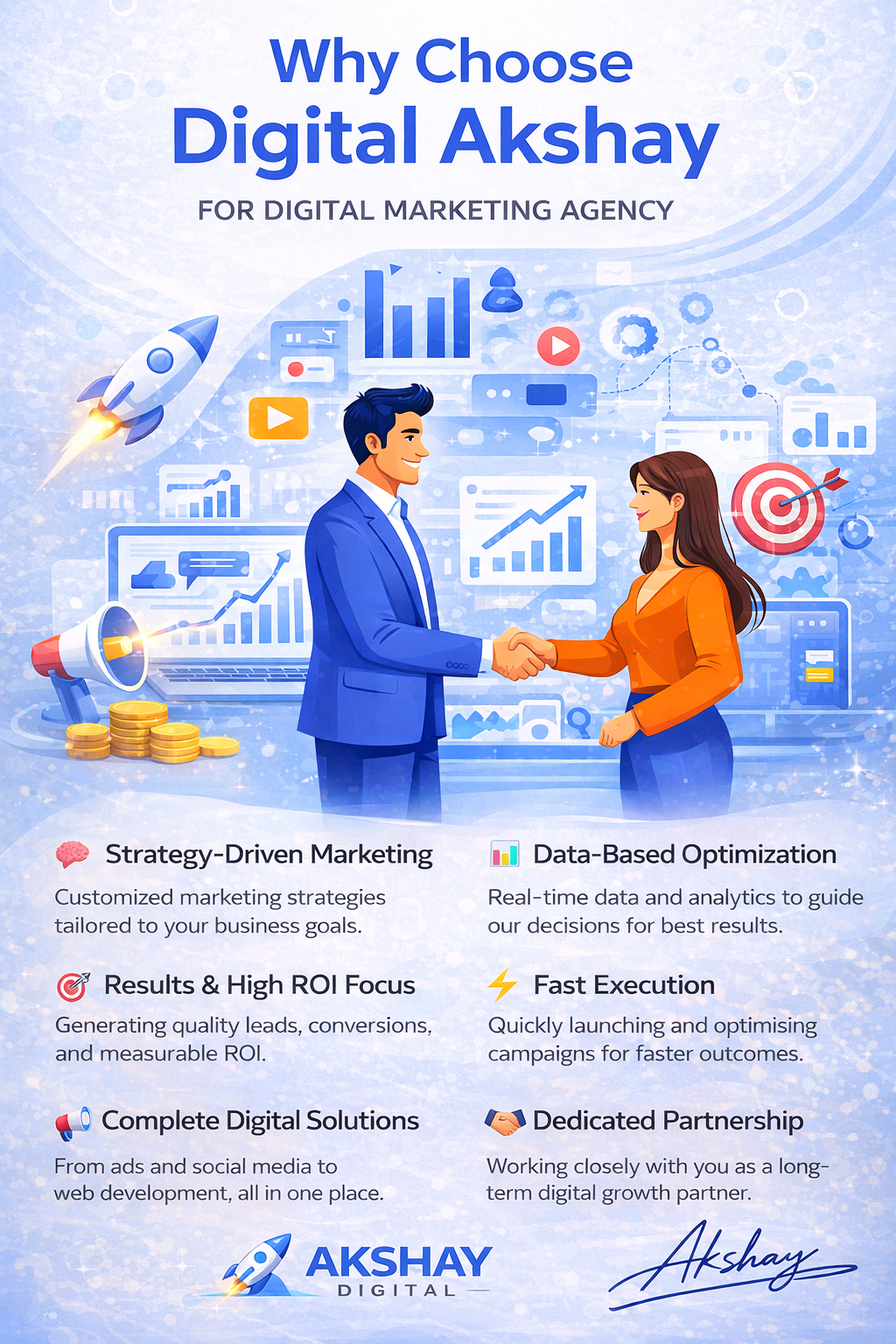 At Akshay Digital, we focus on creating result-driven digital marketing strategies that generate real business impact. Our data-focused approach combines social media marketing, paid advertising, and advanced analytics to increase your brand visibility, attract quality leads, and maximize your return on investment. By continuously monitoring performance and optimizing campaigns, we help businesses achieve consistent growth, higher engagement, and increased sales in today’s competitive digital landscape. Our goal is not just marketing, but delivering measurable success that helps your business scale faster and smarter.